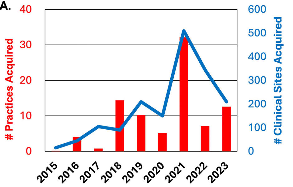 “Between 2013 and 2023, PE firms acquired 114 outpatient gastroenterology practices, encompassing 1169 clinical sites nationwide…That includes 854 clinics, 266 endoscopy centers, and 49 infusion centers. Collectively, these sites employed approximately 2675 physicians and advanced practice providers. In total, around 14% of all gastroenterology clinical sites nationwide are now affiliated with PE-backed platforms.”