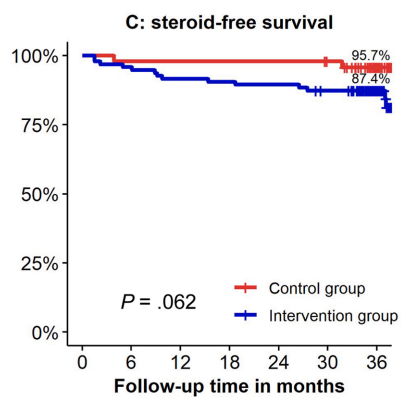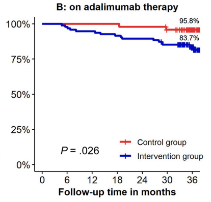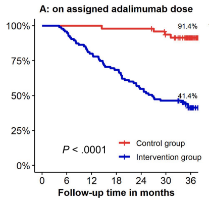 - Kaplan-Meier analyses of secondary end points showed the following probabilities at year 3 (intervention vs control) (Figure 1): remaining on the assigned adalimumab dose, 41.4% vs 91.4% (P < .0001); remaining on adalimumab, 83.7% vs 95.8% (P = .026); corticosteroid-free survival, 87.4% vs 95.7% (P = .062); and complication-free survival, 83.2% vs 97.9% (P = .015)