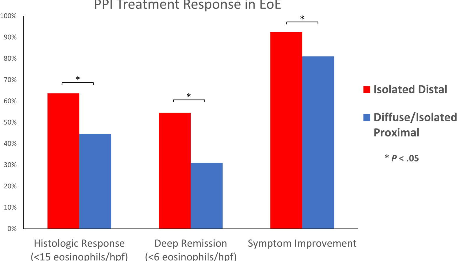 Methods: This was a retrospective cohort study of newly diagnosed adult patients with EoE — All patients received ≥8-week PPI trial and underwent repeat biopsies to assess response. There were including 66 with isolated distal and 200 with proximal/diffuse disease. 86% of patients received twice daily PPI therapy (73% in those with isolated distal disease and 87% in the diffuse/isolated proximal disease.