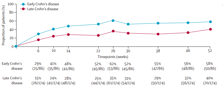- Clinical and endoscopic remission at both week 26 and 52 was achieved in 27 (31·4%) of 86 patients with early Crohn’s disease versus 15 (8·6%) of 174 patients with late Crohn’s disease (difference 22·8%, 95% CI 12·6–33·7)