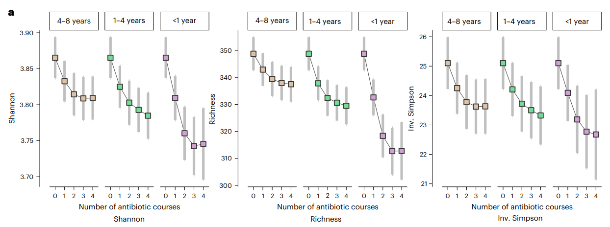 - Antibiotic use <1 year before fecal sampling was associated with the greatest reduction in species diversity, but significant associations were also observed for use 1–4 and 4–8 years earlier.