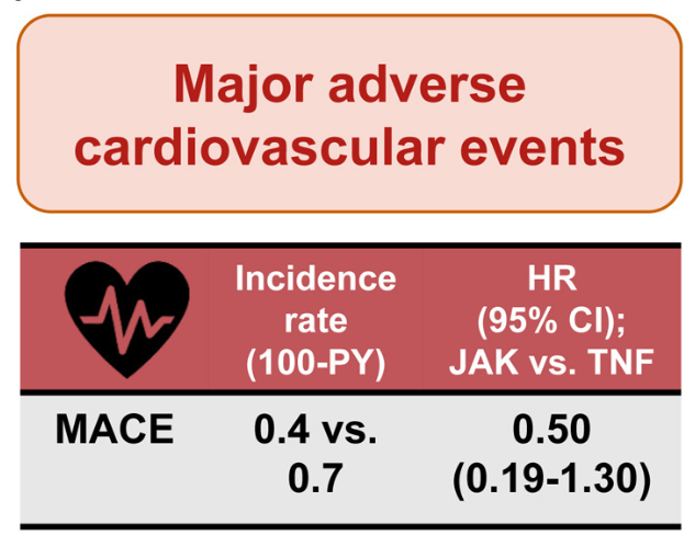 The authors note that their findings differ from the ORAL study (Ytterberg et al. NEJM 2022; 386: 316-326.) which showed higher risk of MACE in patients receiving tofacitinib. In the current study, even in patients deemed to be at higher risk for MACE (age >50 years with at least 1 cardiovascular risk factor), JAK inhibitors were associated with lower incidence and risk of MACE compared with TNF antagonists (IR per 1000 PY, 0.4 vs 2.1, HR 0.10).