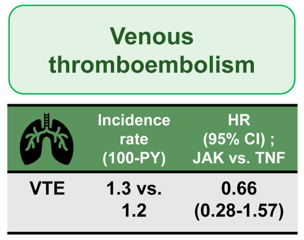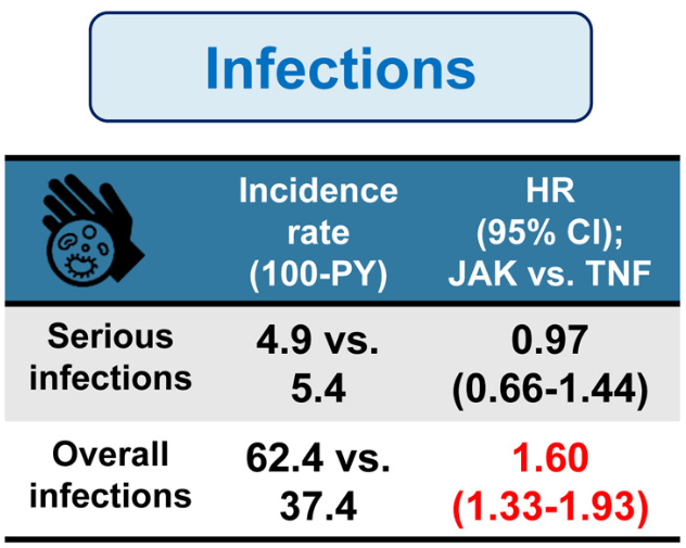 - There was no difference in the risk of serious infections (4.9 vs 5.4; HR, 0.97); however, JAK inhibitors were associated with an increase risk of overall infections (incidence rate, 62.4 per 100 person-years [PY] vs 37.4 per 100 PY; hazard ratio [HR], 1.60)