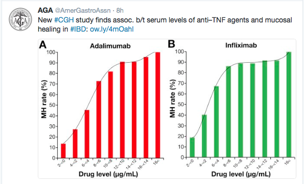 “Levels of infliximab above 5 mcg/mL…and levels of adalimumab above 7.1 mcg/mL identified patients with mucosal healing with 85% specificity. Increasing levels of infliximab above 8 mcg/mL produced only minimal increases in the rate of mucosal healing, whereas the association between higher level of adalimumab and increased rate of mucosal healing reached a plateau at 12 mcg/mL”