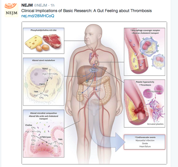What’s new: Zhu et al (Cell 2016; 165: 111-24) “gave mice excess of dietary choline, microbe-generated TMAO enhanced platelet responsiveness in vivo, promoting a prothrombotic phenotype” was blocked by the administration of oral antibiotics. Fecal microbiota transplantation, however, elevated the risk of thrombosis when administered to germ-free mice.