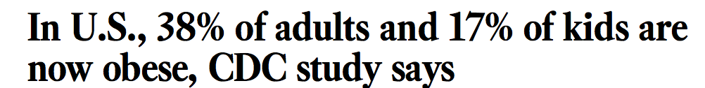 From LA Times (reporting on CDC study): In U.S., 38% of adults and 17% of kids are now obese