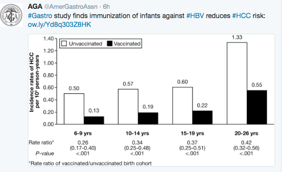In a Gastroenterology study from Taiwan, HBV vaccination has been shown to reduce the risk of Hepatocellular Carcinoma.