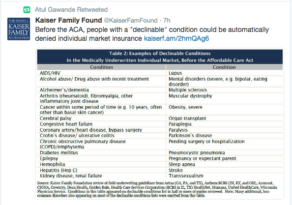 Tweet Week -Preexisting Conditions Before (? and After) Affordable Care Act Posted on December 23, 2016 by gutsandgrowth Share this: Click to email a link to a friend (Opens in new window) Email Click to share on X (Opens in new window) X Click to share on Facebook (Opens in new window) Facebook Like Loading... Related