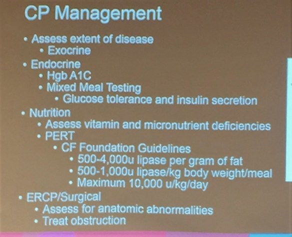 - Discussed screening for pancreatic insufficiency. Directly measuring pancreatic enzymes are more sensitive for early insufficiency, but may be unnecessary if good growth and normal stool elastase.
