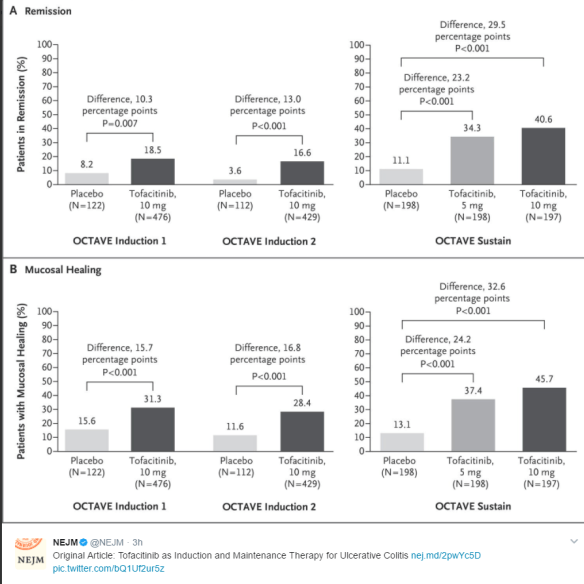 In the OCTAVE Induction 1 trial, remission at 8 weeks occurred in 18.5% of the patients in the tofacitinib group versus 8.2% in the placebo group (P=0.007); in the OCTAVE Induction 2 trial, remission occurred in 16.6% versus 3.6% (P<0.001). In the OCTAVE Sustain trial, remission at 52 weeks occurred in 34.3% of the patients in the 5-mg tofacitinib group and 40.6% in the 10-mg tofacitinib group versus 11.1% in the placebo group (P<0.001 for both comparisons with placebo). In the OCTAVE Induction 1 and 2 trials, the rates of overall infection and serious infection were higher with tofacitinib than with placebo. In the OCTAVE Sustain trial, the rate of serious infection was similar across the three treatment groups, and the rates of overall infection and herpes zoster infection were higher with tofacitinib than with placebo. Across all three trials, adjudicated nonmelanoma skin cancer occurred in five patients who received tofacitinib and in one who received placebo, and adjudicated cardiovascular events occurred in five who received tofacitinib and in none who received placebo; as compared with placebo, tofacitinib was associated with increased lipid levels.