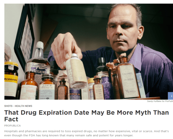 A recent NPR story/ProPublica research reiterates the fact that many medications remain potent long after their expiration dates: That Drug Expiration Date May be More Myth Than Fact