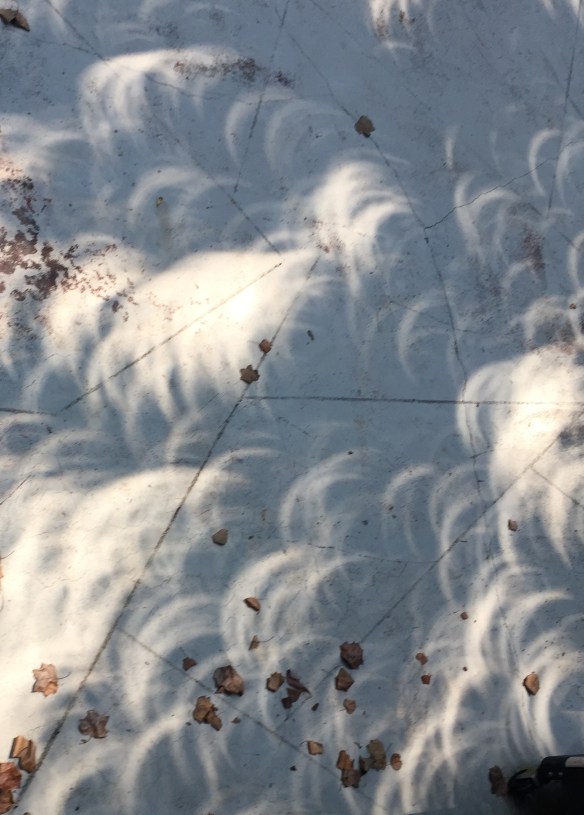 Image Only: Dappled Crescent Shadows Posted on August 23, 2017 by gutsandgrowth August 21, 2017 eclipse (2 days ago) caused unusual shadows: This shadowing was minutes after the peak eclipse with narrow crescents This shadowing was a few minutes later and with broader crescents Share this: Click to email a link to a friend (Opens in new window) Email Click to share on X (Opens in new window) X Click to share on Facebook (Opens in new window) Facebook Like Loading... Related
