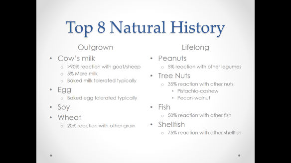 This next slide points out that four of the most common food allergens (cow’s milk, egg, soy, and wheat) are frequently outgrown, whereas with peanuts, tree nuts, fish, and shellfish, it is uncommon to outgrow these allergies..