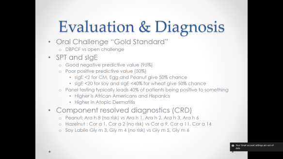 The next slide discusses potential evaluation. While the slide states that the positive predictive value of skin prick tests and serum-based IgE tests may be as high as 50%; in fact, when broad panels of allergy tests are ordered, the positive predictive value can be quite low.