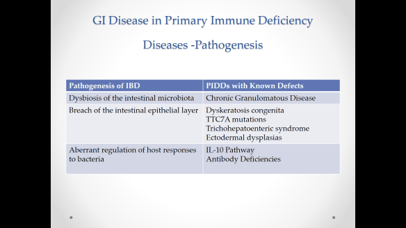 The last part of Dr. Patel’s talk focused on GI disease (eg. inflammatory bowel disease presentation) of primary immune deficiencies. In the bottom slide, the diseases that often present with GI symptoms are boxed.