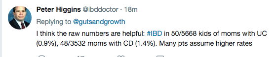 - Hazard ratio for developing IBD in the offspring was 4.63 if maternal ulcerative colitis