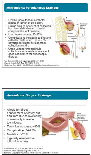 - Endoscopic drainage is first-line approach: equally effective as surgery, fewer complications, equal efficacy, and lower cost