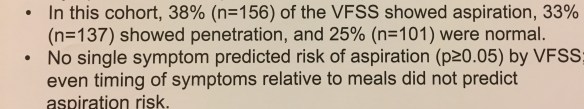 The following slides are from some of the abstract posters. This first poster (next 5 pics) showed that symptom association with meals is not predictive of aspiration among a selected group of children who underwent swallow study evaluations. In the figures, the blue bars are children who passed the swallow study whereas the red bars indicate the children who failed the swallow study.