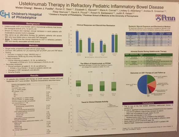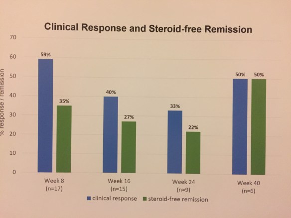 The next poster provides data from CHOP experience with Ustekinumab. Overall, in this highly-selected (refrcactory) population the long term improvement was low; while one-third had steroid-free remission at week 8, this was not maintained at week 16 and week 24. In addition, among the 22 patients, one developed transverse myelitis.