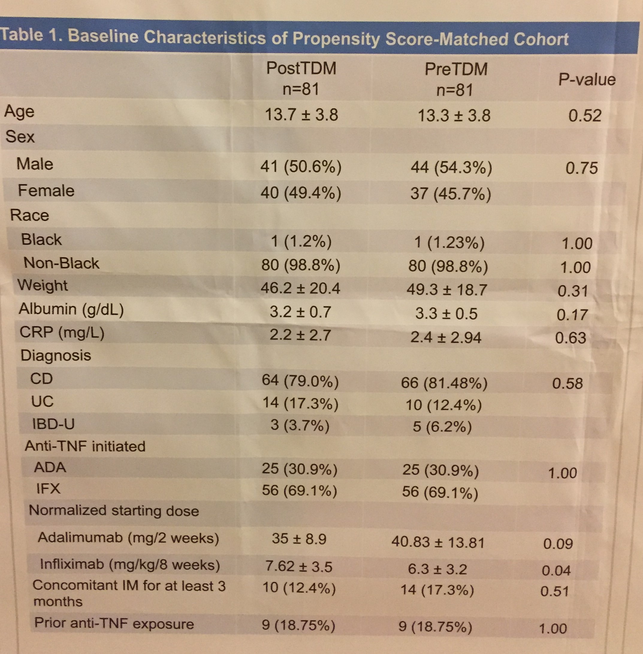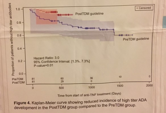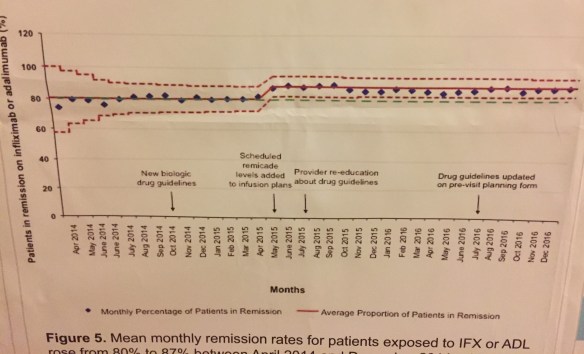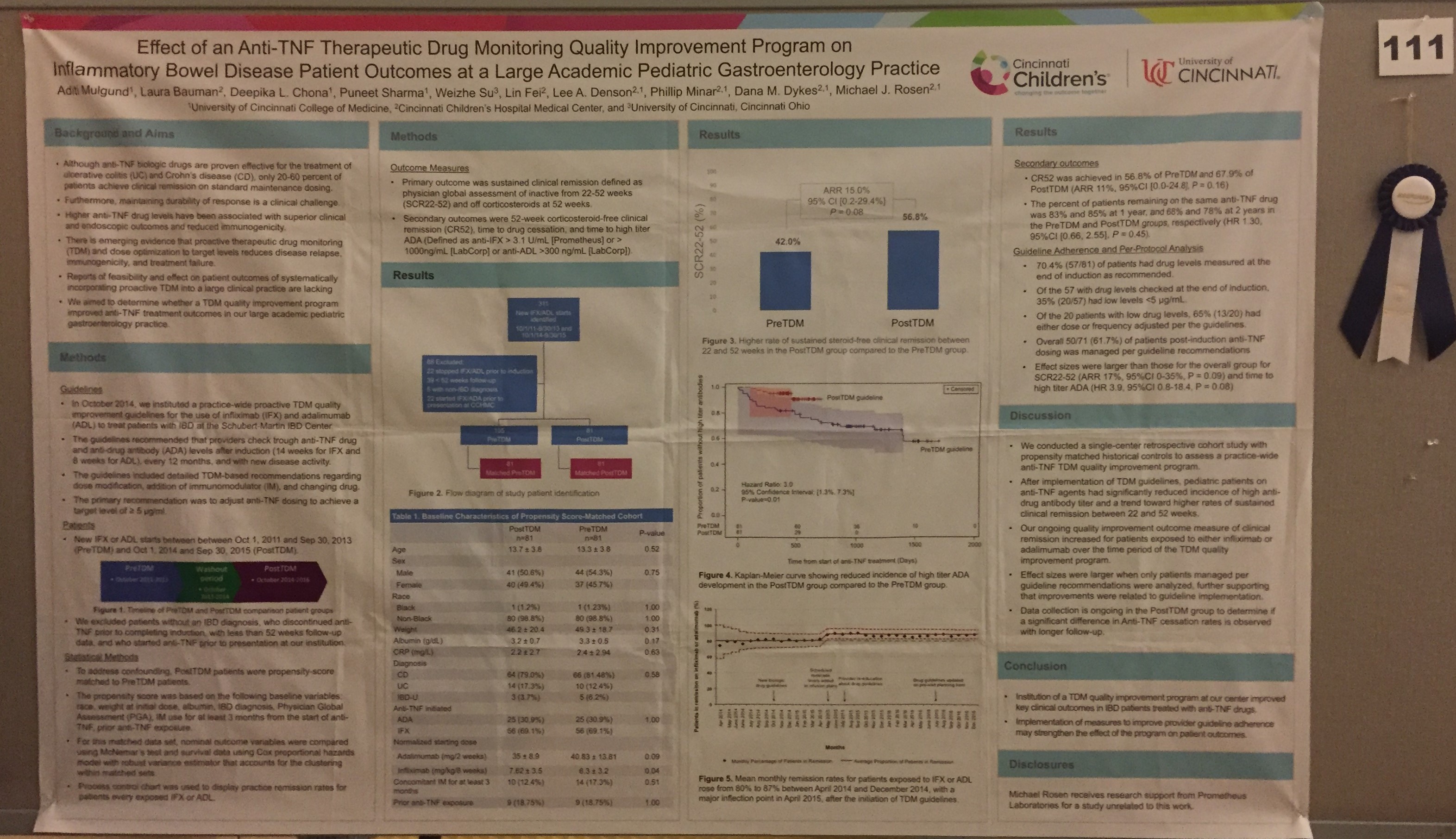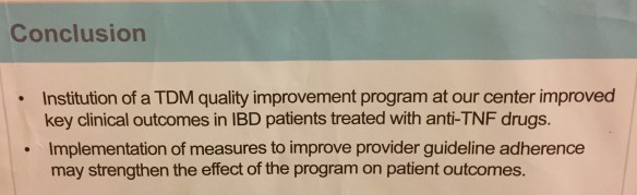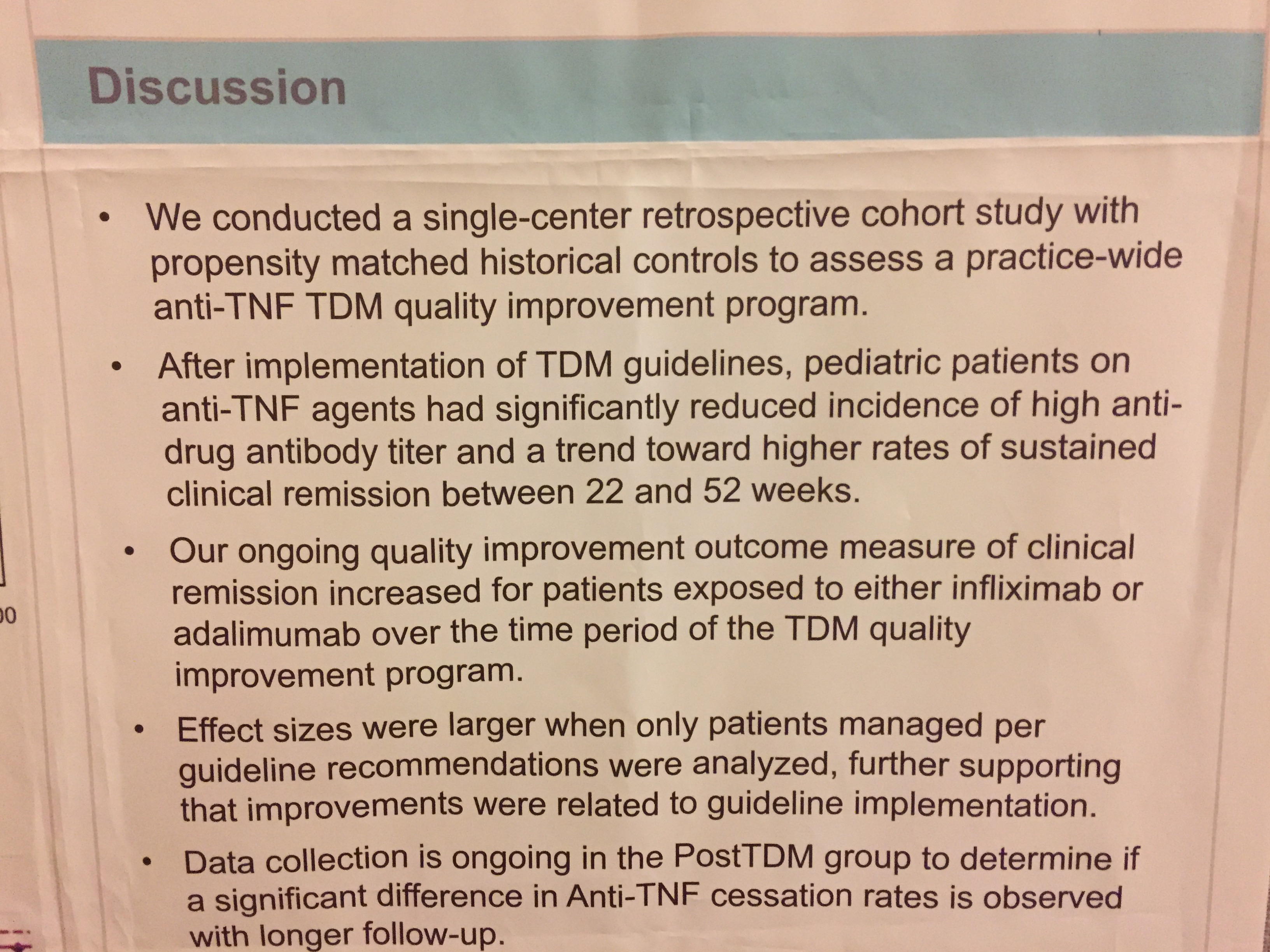 In support of Dr. Baldassano’s talk (NASPGHAN17: Treat to Target and Tight Control), this poster from the Cincinnati group (A Mulgand et al) showed that therapeutic drug monitoring has been associated with improved clinical remission scores (80% to 87%). Correlation with a more objective marker of remission along with longer followup is now needed. One of the authors, Dana Dykes, has joined our group in Atlanta!