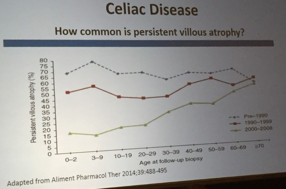 At this lecture, I asked Dr. Hill what he would recommend for an asymptomatic pediatric patient with ongoing intestinal inflammation who was strictly adherent to a gluten-free diet, who had no other recognizable diseases, and who had normalized their serology on treatment. His response was that in adults that ~50% of patients improve with better attention to diet. Thus, currently besides further dietary scrutiny, it is unclear what should be done in the pediatric population should one find ongoing mucosal disease in an asymptomatic adherent patient.