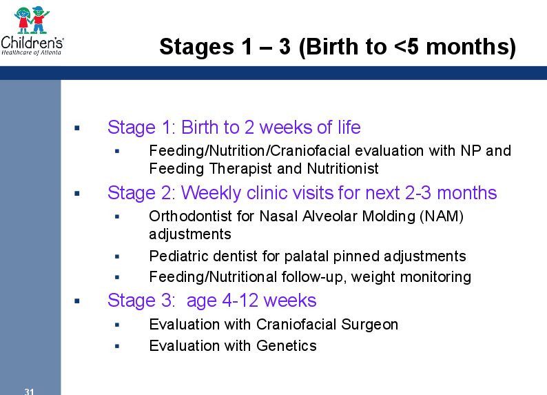 Here are a few slides –Thanks to Kipp Ellsworth for coordinating these talks and making slides available. The first group of slides explains who and how to evaluate for feeding problems, the next group discusses the specific role of the craniofacial team, and the last group of slides discusses nutritional management.