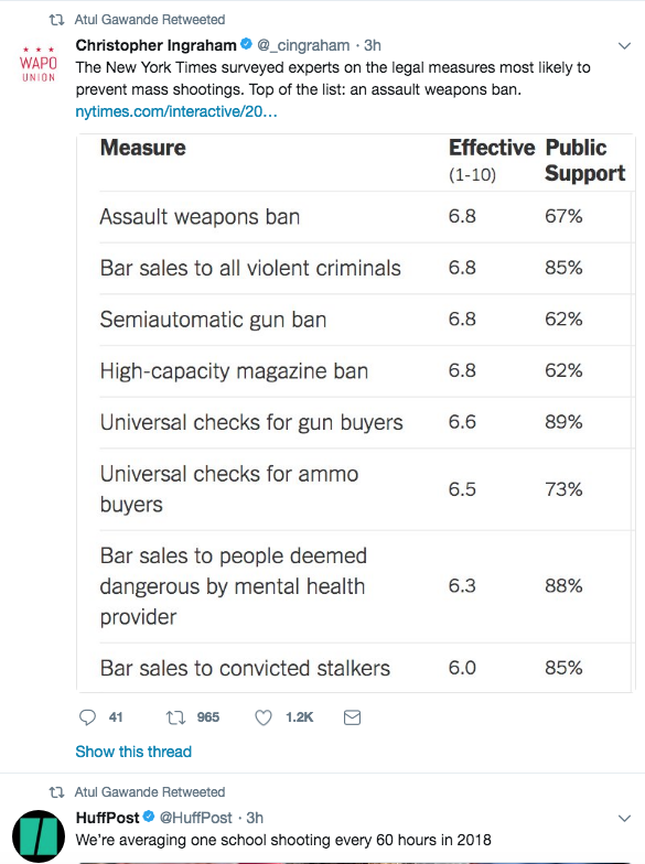 Between 2001-2013, gun related deaths exceeded the total number of deaths from AIDS, terrorism, war, and illegal drug overdoses combined (according to Vox -see Firearm Mortality in U.S). Here are some tweets in reaction to yesterday’s tragic events.