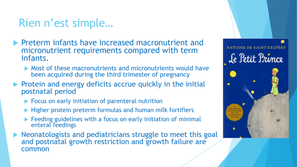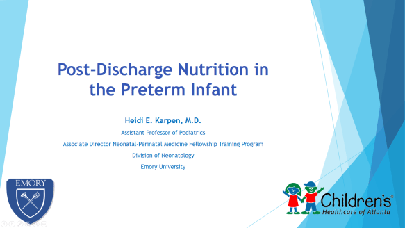 A subsequent lecture on “Nutrition for the Premature Infant” by Heidi Karpen (Emory University, Professor of Pediatrics) provided a good overview of the ongoing efforts to improve nutritional outcomes for premature infants.