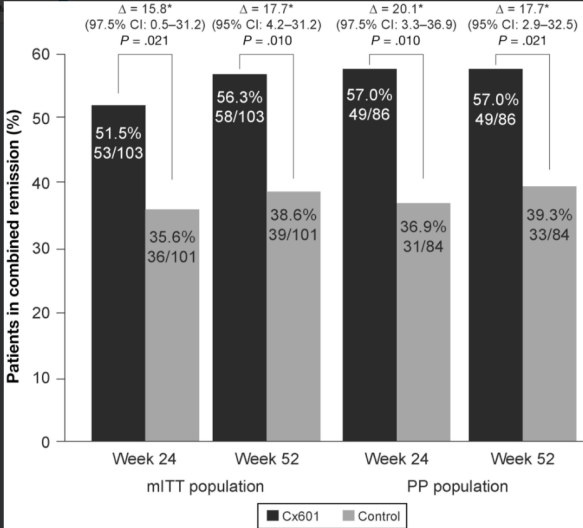 - As noted in Figure 1 (below), combined remission occurred in 51.5% of Cx601-Rx patients compared with 35.6% for placebo at week 24; at week 52, combined remission occurred in 56.3% of Cx601-Rx patients compared with 38.6%