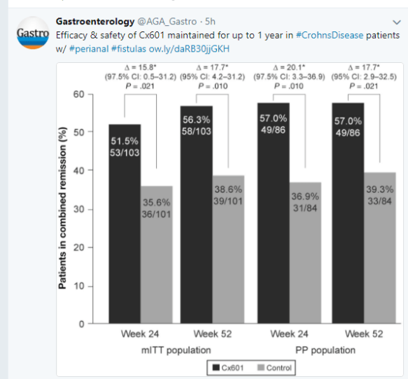 They used a single local injection of 120 million Cx601, a suspension of allogeneic expanded adipose-derived stem cells, and compared to a placebo injection. This study comprised 212 patients from 49 centers. The primary endpoint, labelled “combined remission,” was based on absence of draining fistulas and MRI findings.