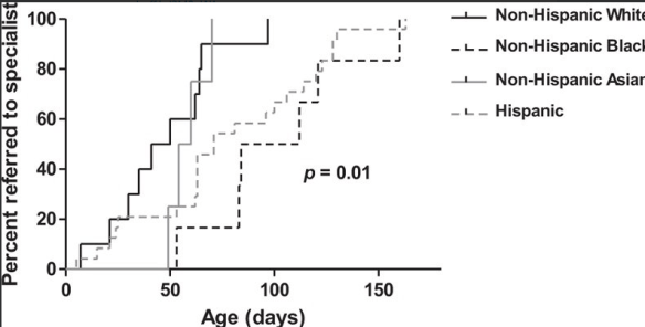 Specifically, non-Hispanic white infants were diagnosed earlier than non-Hispanic black infants and Hispanic infants (P=.007); this was related to the timing of referral from the primary care physician. The authors speculate that this could be related to three factors: