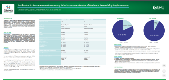 Methods: From December 1, 2016 through May 1, 2018, the charts of all patients who underwent PEG tube placement in our children’s hospital were reviewed. This period coincided with an optional practice change in antibiotic prophylaxis. Prior to the study period, the typical patient received prophylaxis with a three-dose regimen of cefoxitin. During the study period, at the discretion of the gastroenterologist, patients received either a three-dose regimen of cefoxitin (n=38) or treatment with cefazolin (n=109); 73 patients received a single dose of cefazolin prior to PEG placement and 36 received multiple doses. The initial dose of either regimen was given within thirty minutes of placement. All patients were observed for at least 24 hours. In patients with PEG tube site infections based on clinical assessment, rescue antibiotic treatment was prescribed.