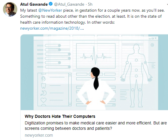A terrific piece by Atul Gawande explores the issues related to adoption of EMRs (electronic medical records): Why Doctors Hate Their Computers