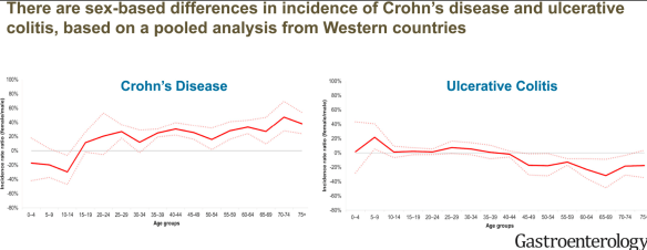 - For ulcerative colitis, there was a divergence in risk after 45 years of age, when men had a significantly higher incidence.