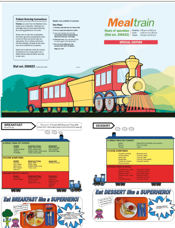Although most children’s hospital food environments include food items that have low nutritional value, this study highlights that nutrition education using menu labeling can be successfully implemented and can encourage children and their families to make healthier choices. It is our hope that labeling may also encourage hospital food providers to improve food quality at the hospital by decreasing red-light foods and increasing healthy food options at every meal. More research is needed to determine optimal techniques for various age ranges and develop menus that are age-appropriate and tailored for specific patient populations.”