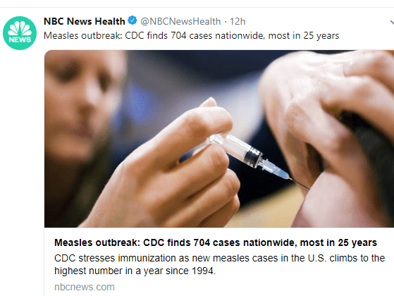 704 Measles cases for this year were reported on April 30th. It is likely to climb much higher. More than 40,000 cases were reported in Europe in the first 6 months of 2018.