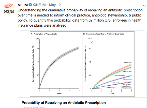 A recent letter (SW Olesen et al. NEJM 2019; 380: 1872-3) showed the frequency of filling antibiotic prescriptions in the U.S. from 2011-2014 using the Truven Health MarketScan Research Databases (62 million enrollees).