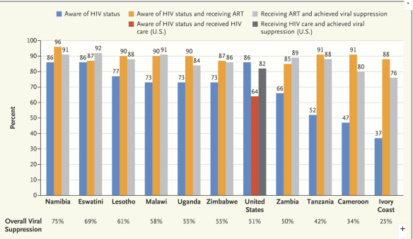 Overall, the U.S. overall viral suppression rate, which is the percentage of all people with HIV in whom the virus is suppressed, is only 51%. In contrast, the rates for Nambia, Uganda, and Zambia are 75%, 55%, and 50% respectively (U.S. measures use slightly different denominators than other countries.)