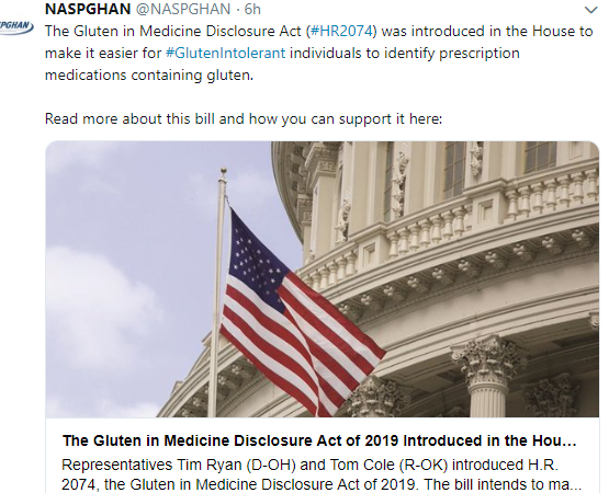 Link: The Gluten in Medicine Disclosure Act of 2019 Introduced in the House