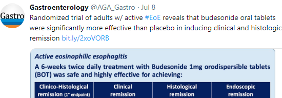 Full Text Link (courtesy of AGA twitter feed):Efficacy of Budesonide Orodispersible Tablets as Induction Therapy for Eosinophilic Esophagitis in a Randomized Placebo-Controlled Trial AJ Lucendo et al. Gastroenterol 2019; 157: 74-86. https://doi.org/10.1053/j.gastro.2019.03.025