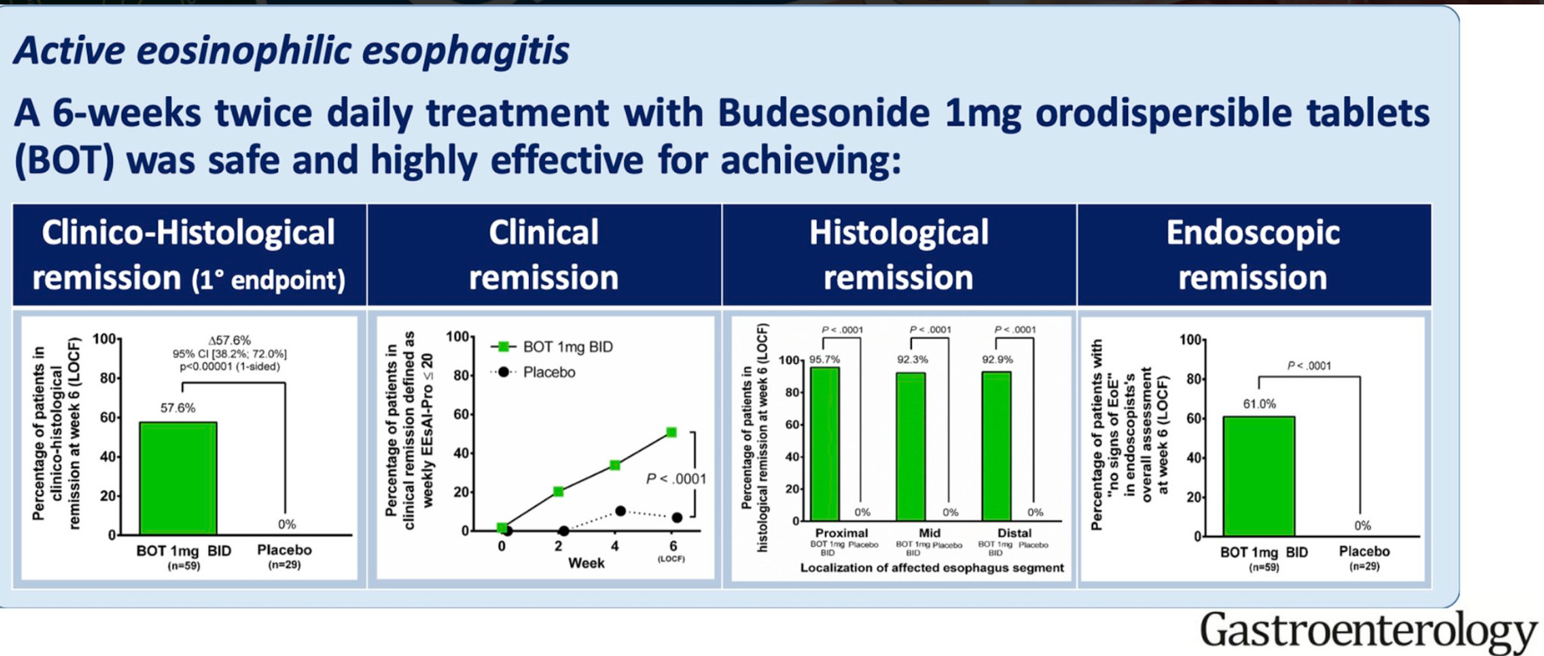 Swallowed topical-acting corticosteroids are recommended as first-line therapy for eosinophilic esophagitis (EoE). Asthma medications not optimized for esophageal delivery are sometimes effective, although given off-label. We performed a randomized, placebo-controlled trial to assess the effectiveness and tolerability of a budesonide orodispersible tablet (BOT), which allows the drug to be delivered to the esophagus in adults with active EoE.