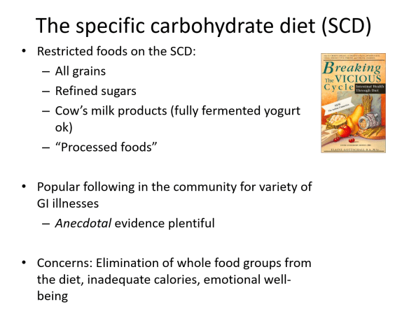 - Newer dietary approaches are being studied and may be effective. Diets like the specific carbohydrate diet (SCD) can be considered, particularly in patients with milder disease.