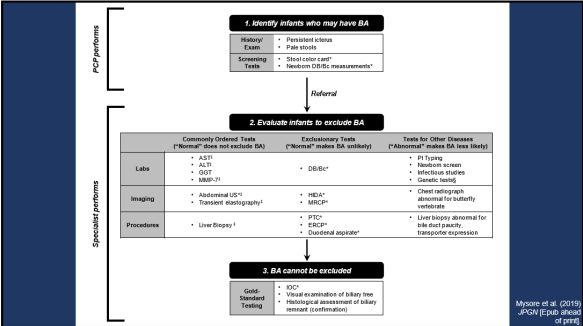 As for this algorithm, in my opinion, the 1st step needs to be to exclude emergencies associated with infantile cholestasis: coagulopathy, hypoglycemia, sepsis, and checking urine for reducing substances (cow’s milk formula can worsen liver disease if galactosemia is present). Subsequently, evaluation needs to proceed quickly to determine the etiology.