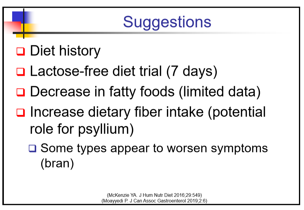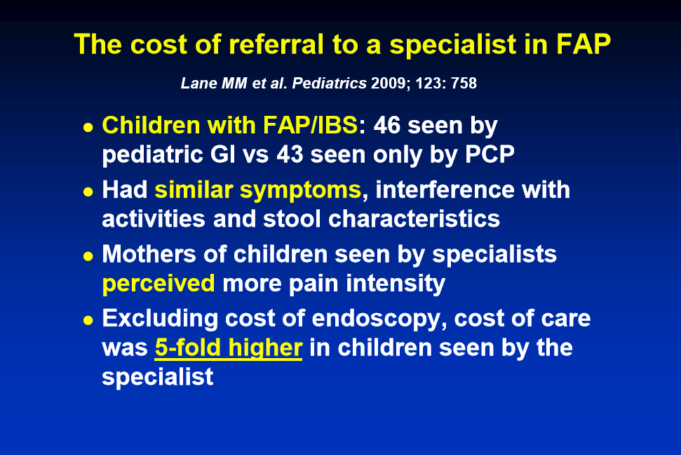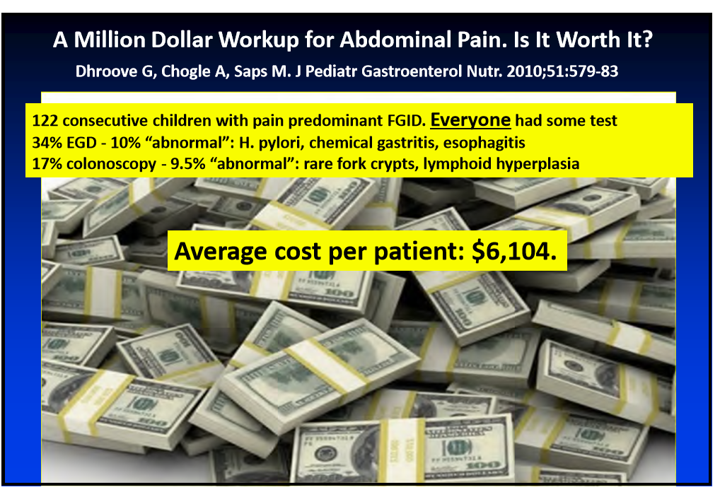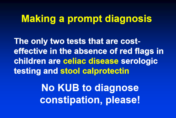 • Testing –only tests that are cost-effective: celiac disease and stool calprotectin.  “Don’t get KUB for constipation.”