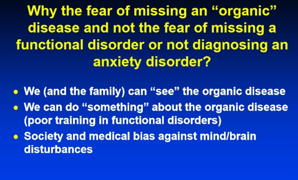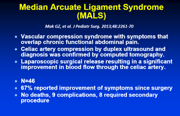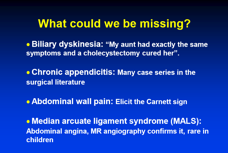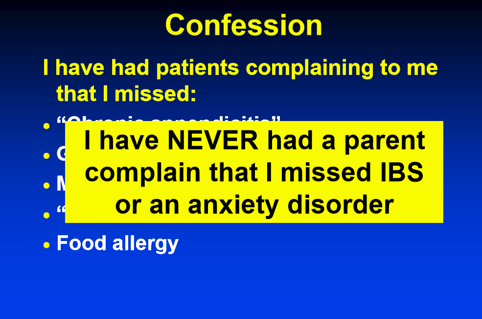 • Families never complain about doctors missing irritable bowel syndrome and anxiety. They may complain about missing diagnosis which are controversial with regarding to chronic pain (‘chronic appendicitis, gallbladder dyskinesia, ‘mild’ IBD, median arcuate ligament syndrome, and food allergies)