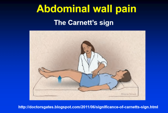• Abdominal wall pain is often overlooked.  Check Carnett sign.