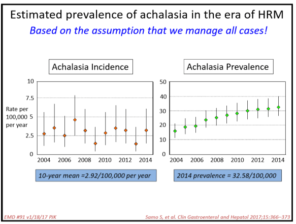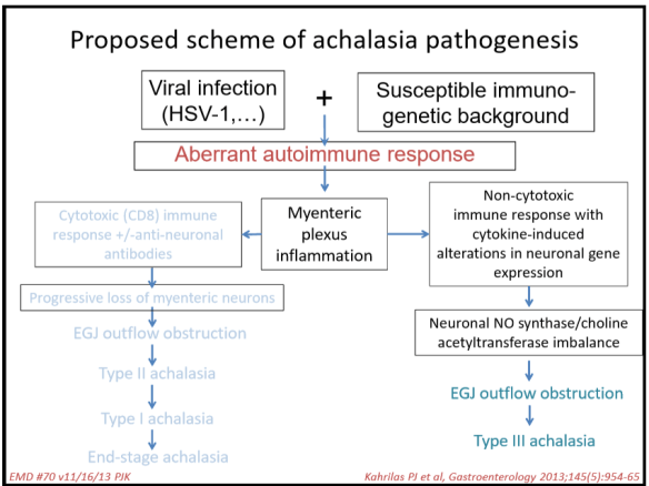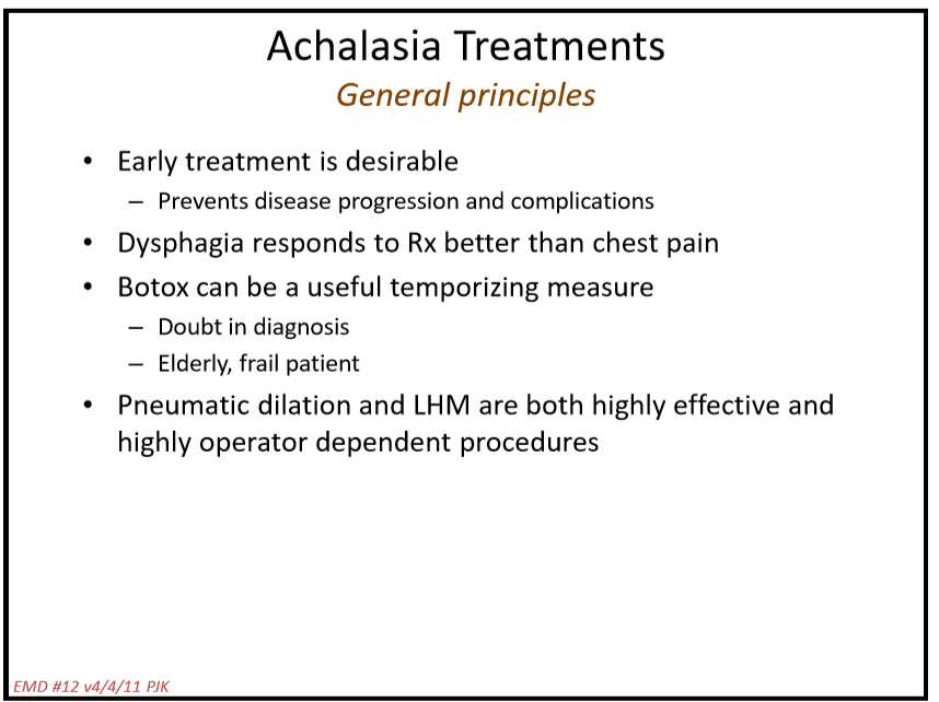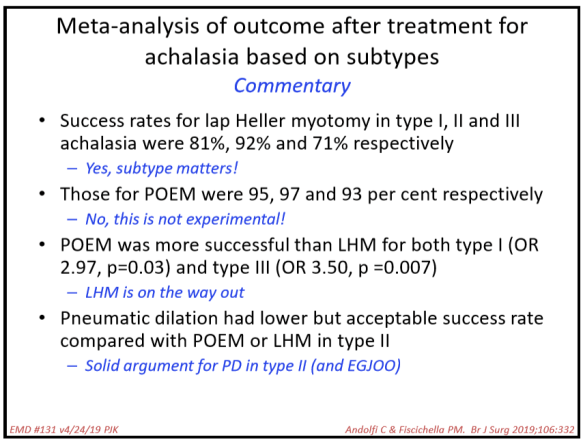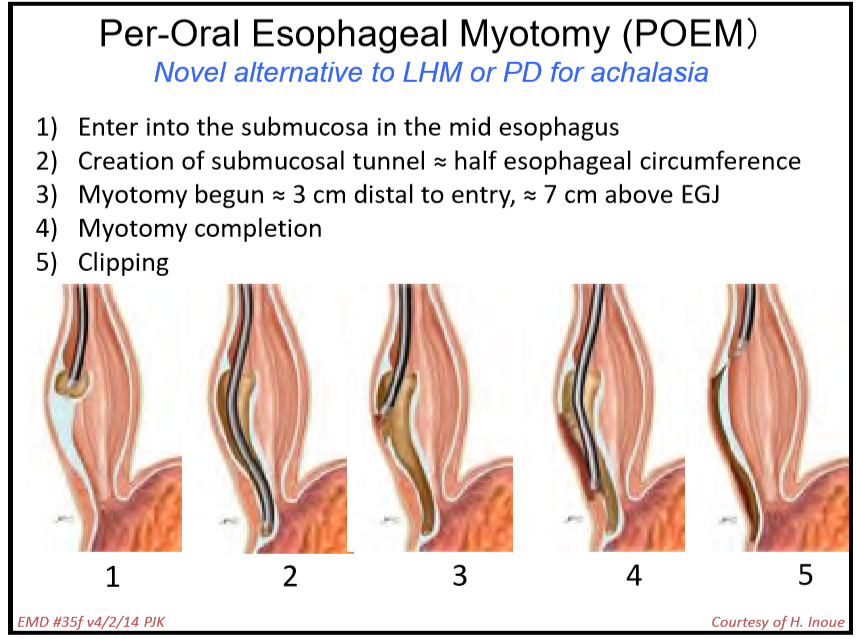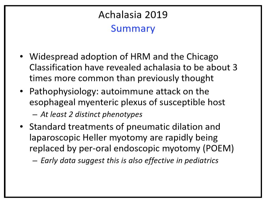 • Discussed POEM as newer treatment. It appears to be more effective than either Heller myotomy or pneumatic dilatation in adults.  So far, there is limited experience in pediatrics though it appears to mirror adult experience