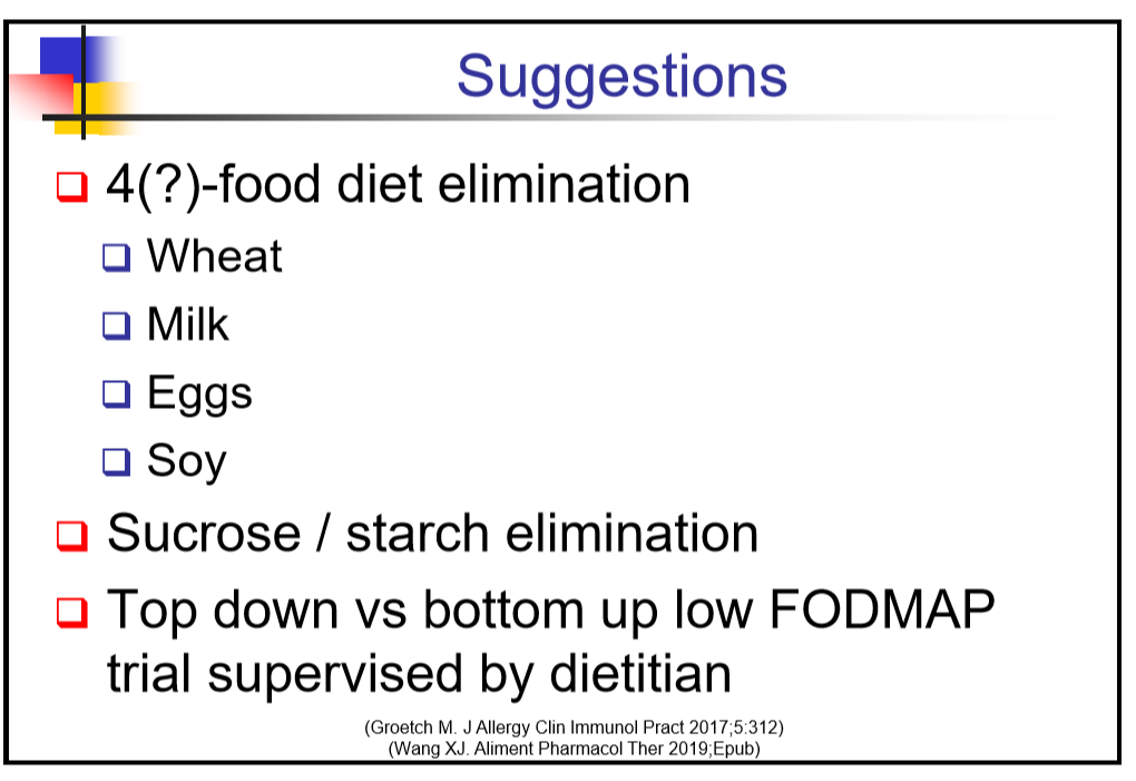 • Eosinophilic esophagitis (EoE) treatment does not help abdominal pain but can help if patient has dysphagia