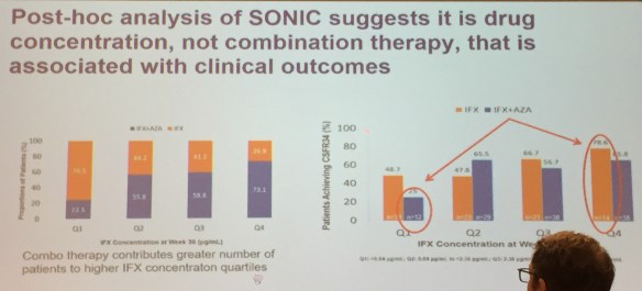 - Combination therapy in Sonic study was associated with higher infliximab levels. It appears that optimized monotherapy is as effective as combination therapy (Colombel study).