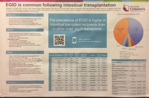 The poster below reported a high frequency of eosinophilic disorders in children who have undergone intestinal transplantation. Related blog post: Eosinophilic disease in children with intestinal failure